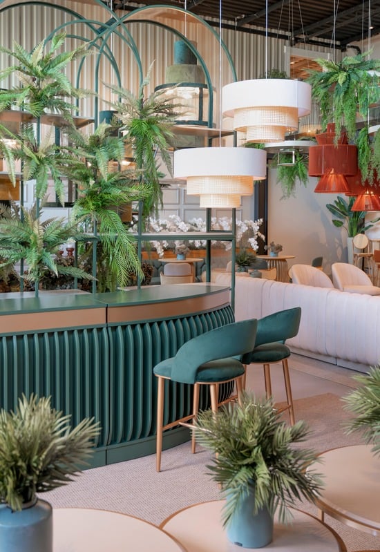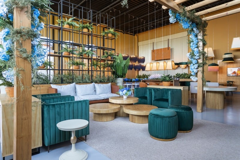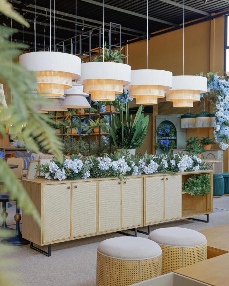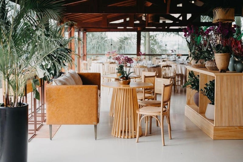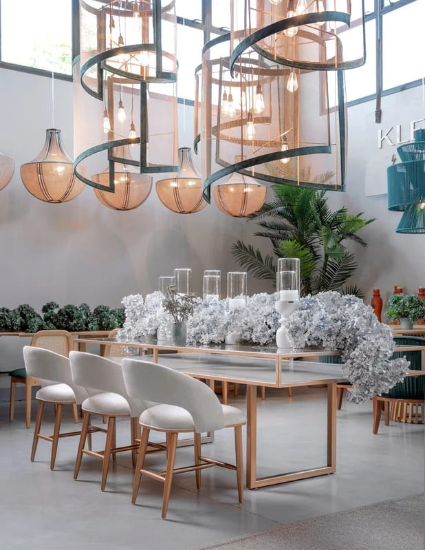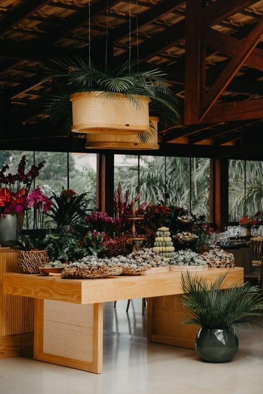 As mesas, balcões e aparadores com o seu toque em laca, madeira e ferro e acabamento em palha natural trazem uma diversidade de composições para os salões de festas, tornando-o, assim, um ambiente onde as pessoas podem se sentir leves e mais à vontade.